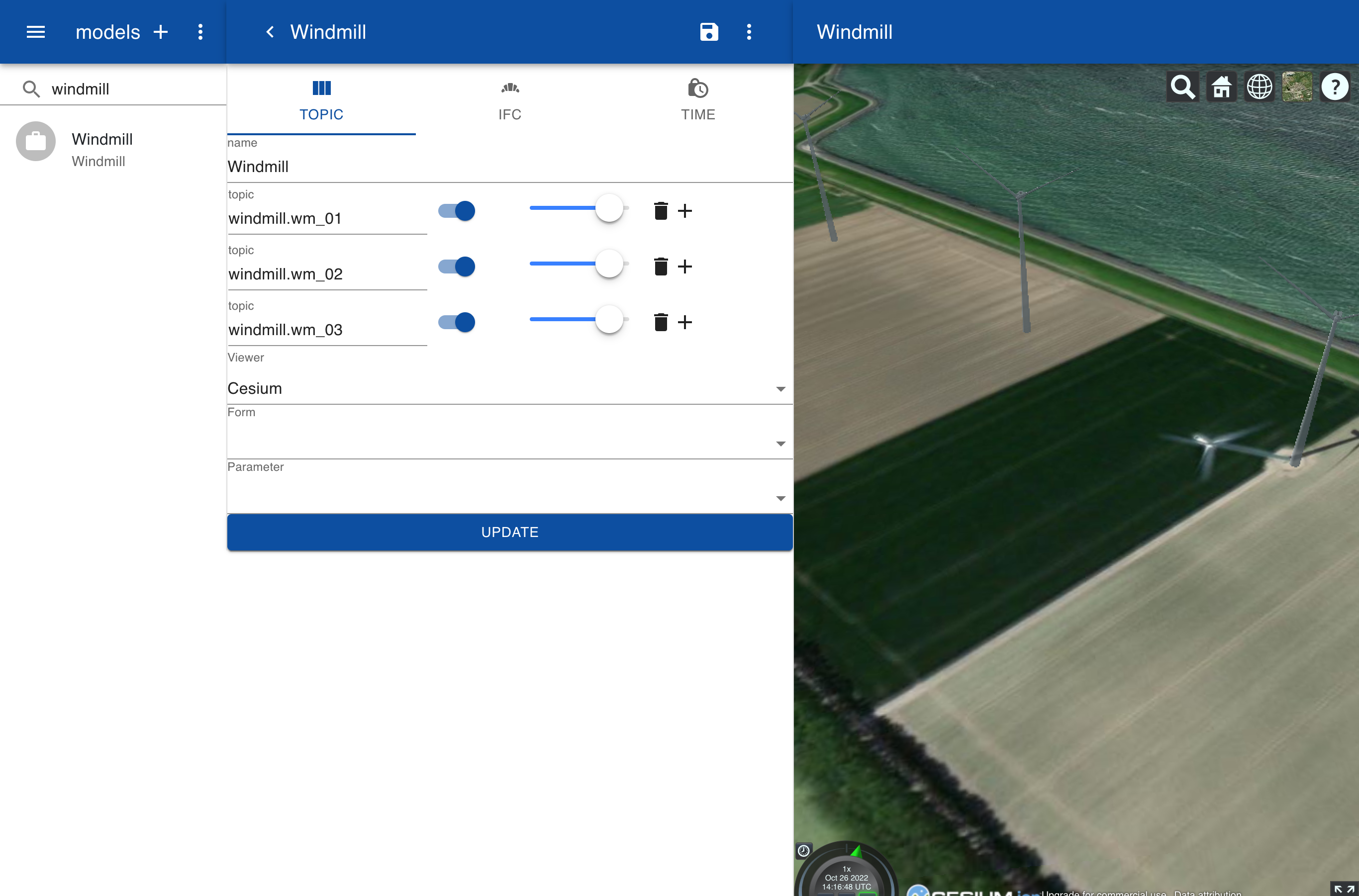 The live animation of the windmills in the Cesium environment is created by adding the topics for the three windmills and select the Cesium viewer.