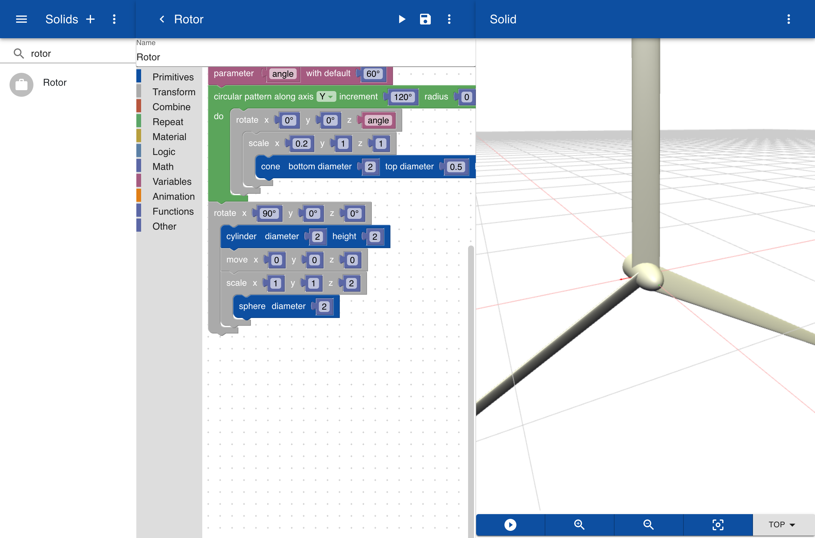 The axis of the rotor is created by a cylinder and a sphere, which are rotated 90 degrees along the X-axis. The blade is created by a cone with a bottom diameter of 2 and a top diameter of 0.5. The cone is scaled to simulate a flat rotor blade and it has a variable rotation defined by parameter angle.