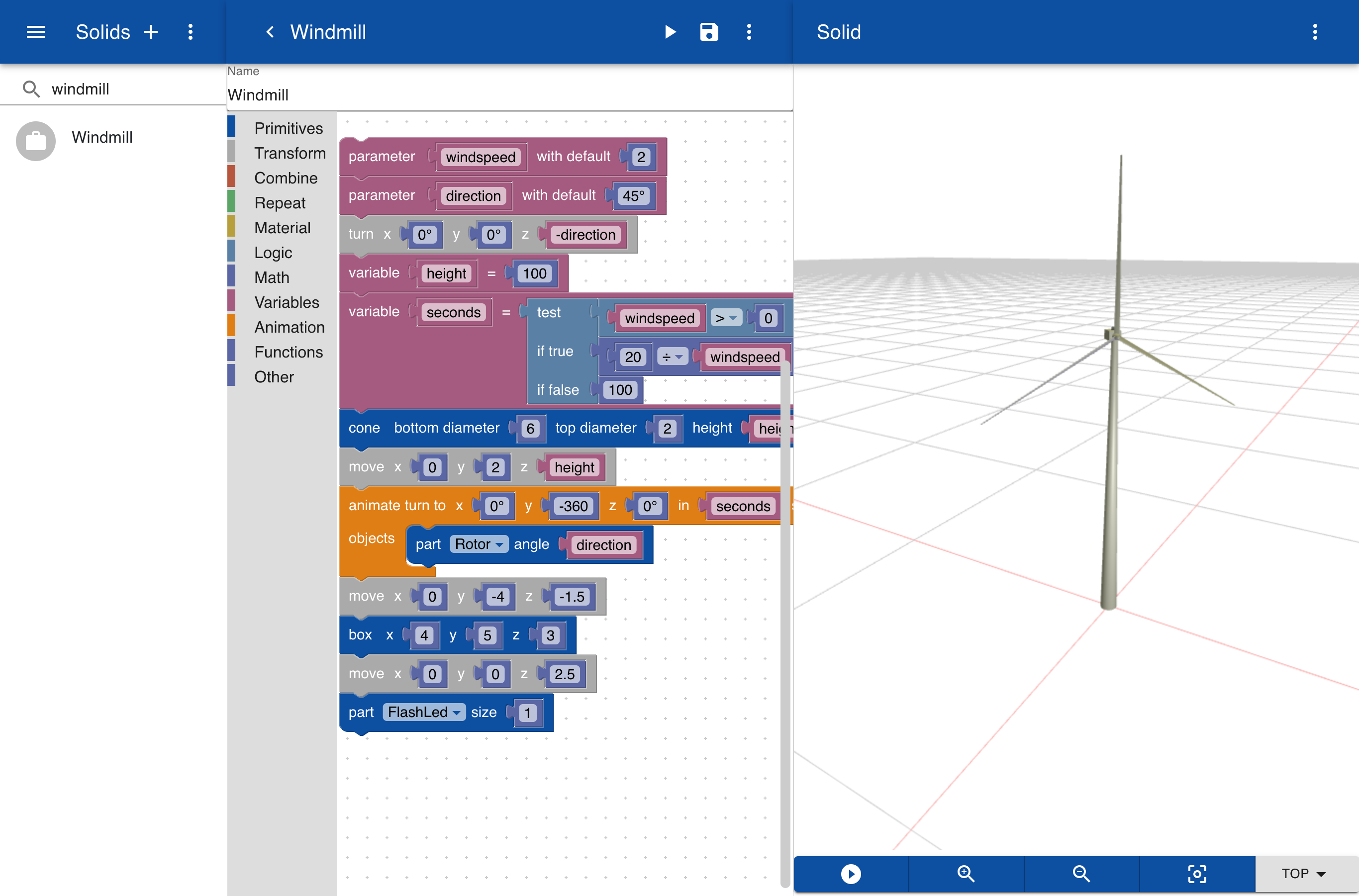 The windmill pole is created by a cone and the rotor is attached to the top, together with a box and a flashlight. The rotor is placed inside an animation block which rotates the part along the Y-axis in a number of seconds. The parameter seconds is calculated from the parameter windspeed and the parameter direction is used to rotate the whole part.