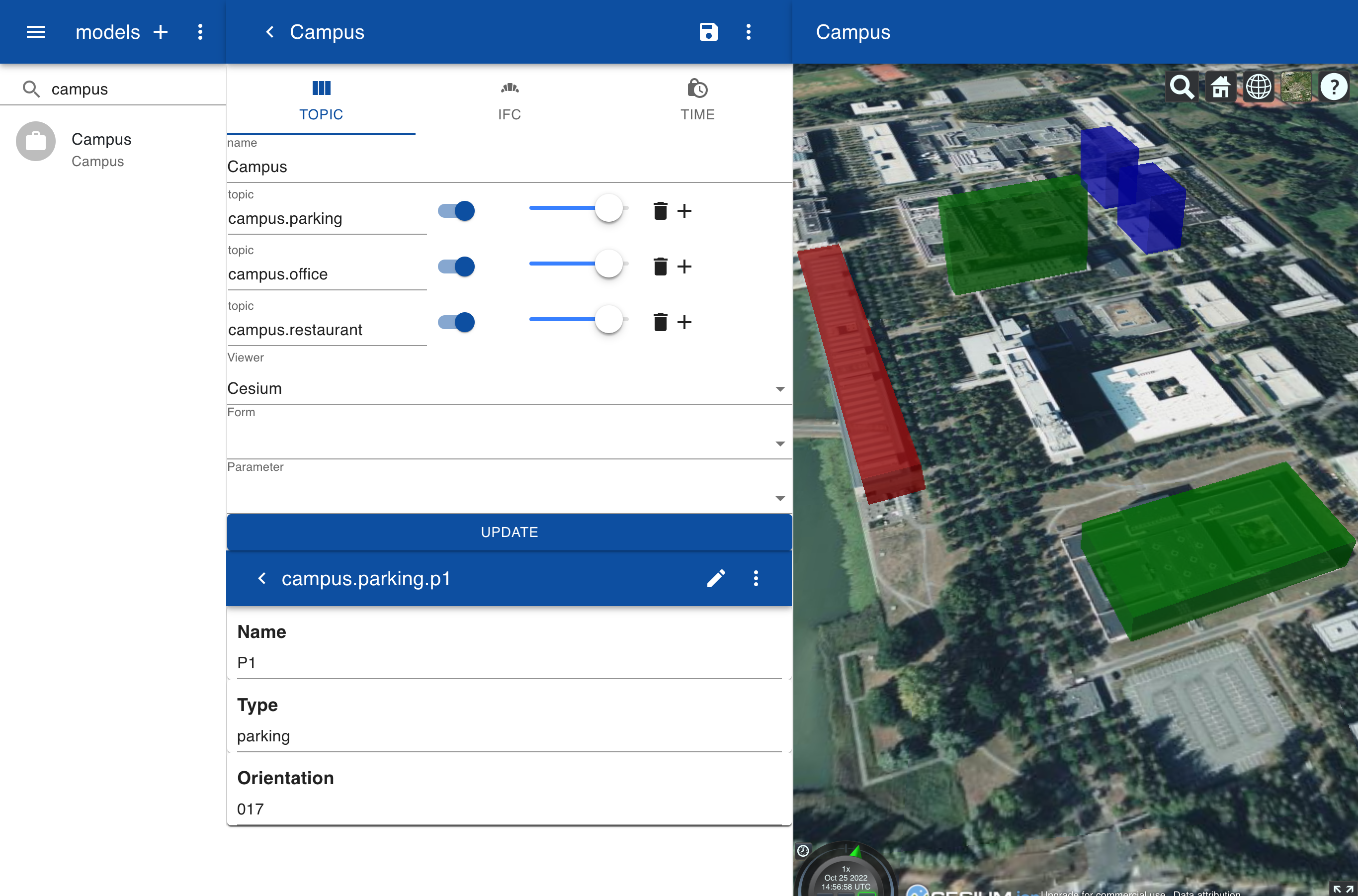 Next we create a new model with name Campus and add three topics campus.parking, campus.office and campus.restaurant. Since we want to show the location on the earth surface we select the Cesium viewer. x