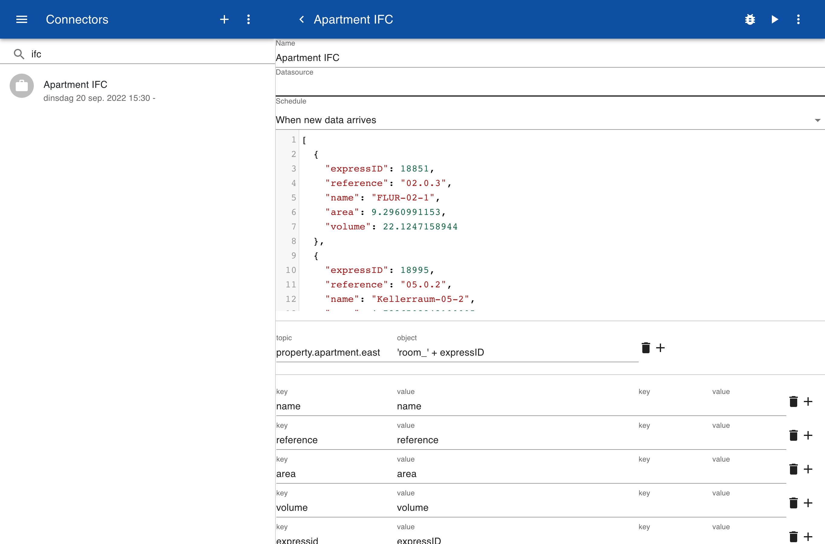 After the model is displayed select the option extract from the details menu. This generates a JSON file with all the spaces and their associated information such as the name, area and volume. You can now create a new connector to import the JSON file and map to topics. The key expressid is used to link the volume element in the BIM model to the topics.