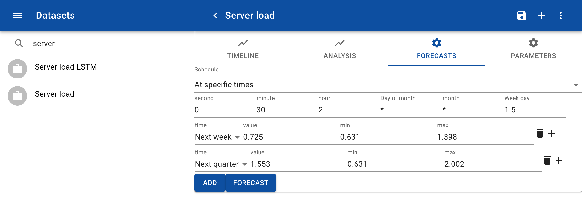 In this example we create a forecast for CPU usage for next week and next quarter. In the dataset click on the tab Forecasts. Click on the Add button to add a forecast. In the forecast, enter the period, for example Next quarter. You can add multiple forecasts for a topic. Click on Forecast to calculate the forecast. The Value shows the predicted value. The Min and Max show the minimum and maximum values in the period until the time and date for the forecast. In case of server load, you may want to ensure that the maximum predicted load at any day or hour is below a certain level. In the Schedule you can define an interval for retraining the model based on the latest data. You can select one of the standard options like Every day or enter a custom period according to the 'cron' definition. In this example, the model is retrained every work day on 2:30 at night.
