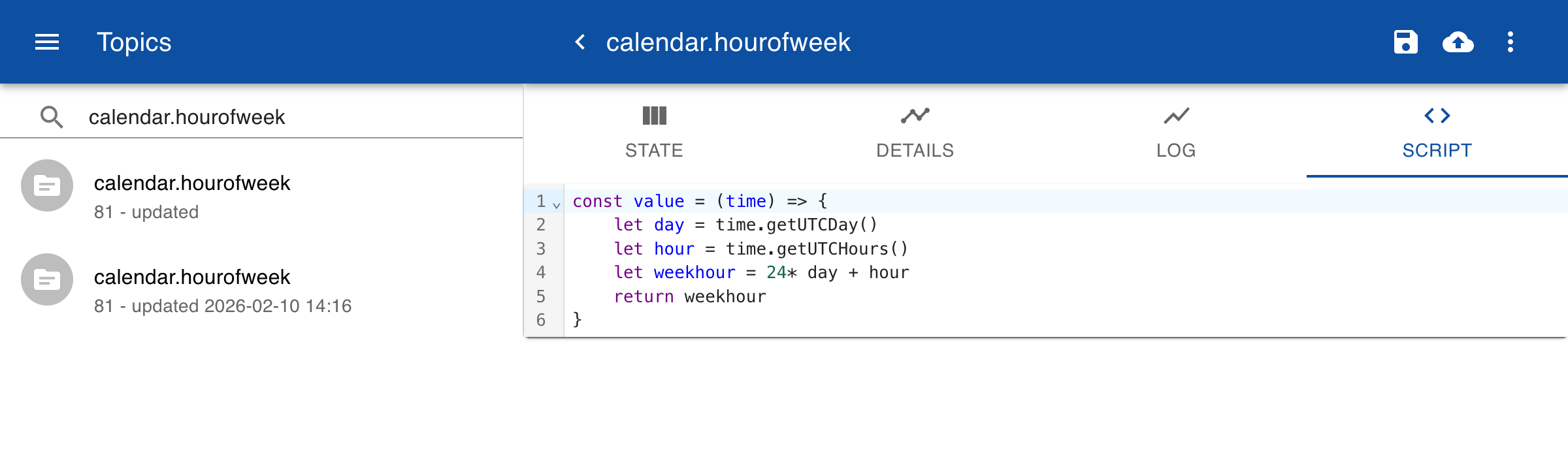 In this example we use special topics where the value is defined by a script. Create a new topic and click on the tab Script. Here you can enter a JavaScript function that returns a value based on the time input that is provided during the query of a time range. So instead of importing a CSV file with values, the values are dynamically generated.