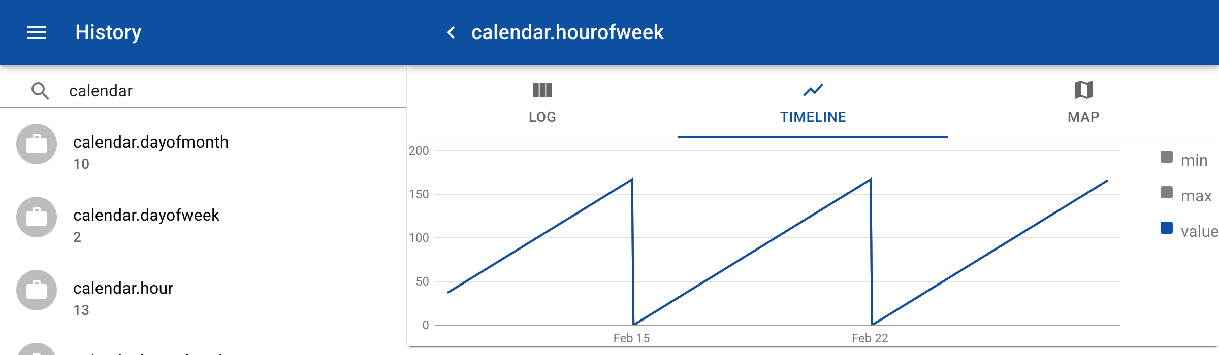 To view the result go to History and search for the topic calendar.hourofweek. Enter a time range from Now to Next month and click on the tab Timeline.