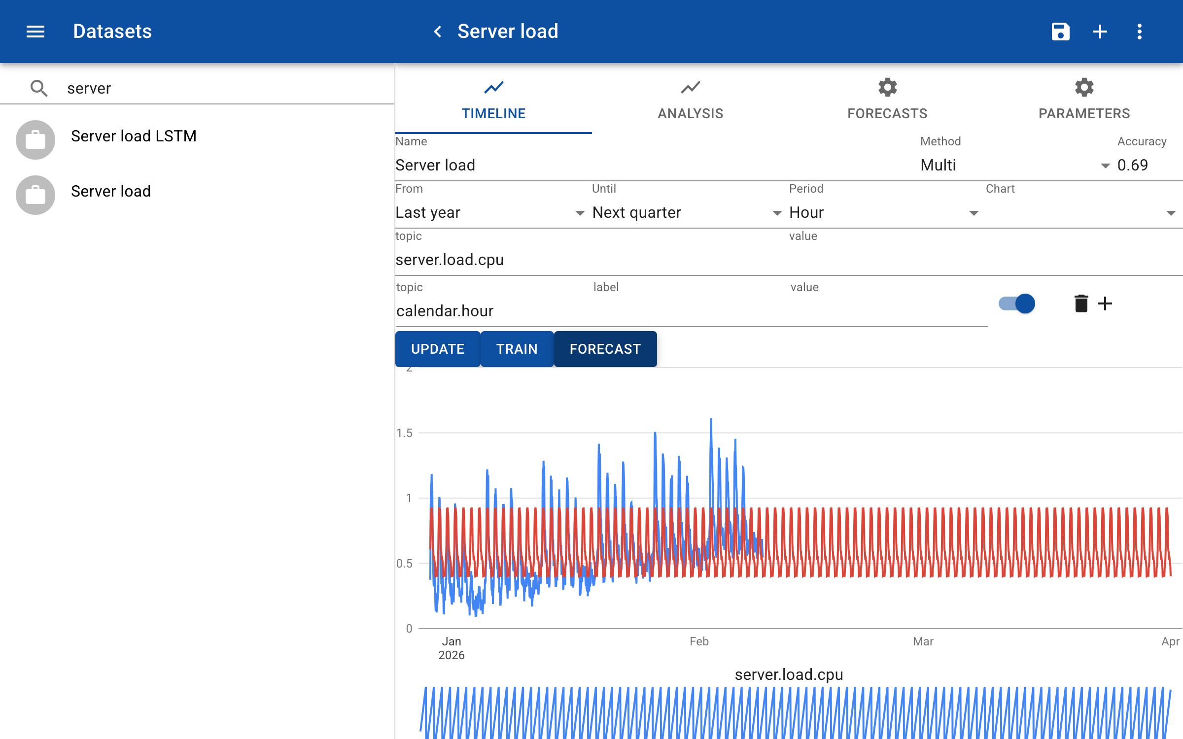 In this example we predict the CPU load based on the value of other inputs: the hour of day, the day of week and the number of days in time since 1970. The input calendar.hour helps to predict the daily pattern of high usage around 10:00 AM and low load at night. As you can see below, the model has picked up the daily pattern of high usage during the day and the predictions remain constant further in the future, unlike with the 'LSTM' model.