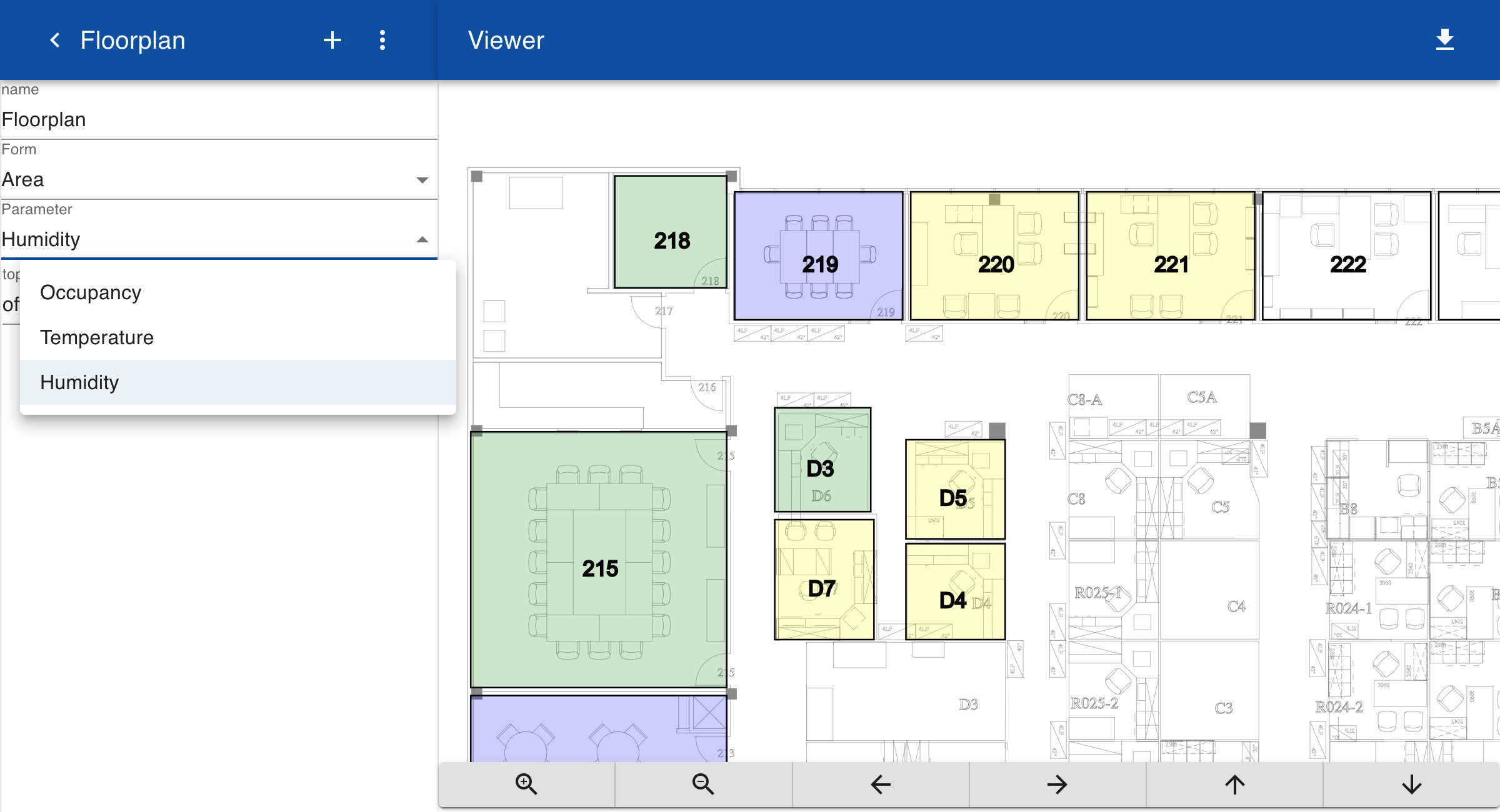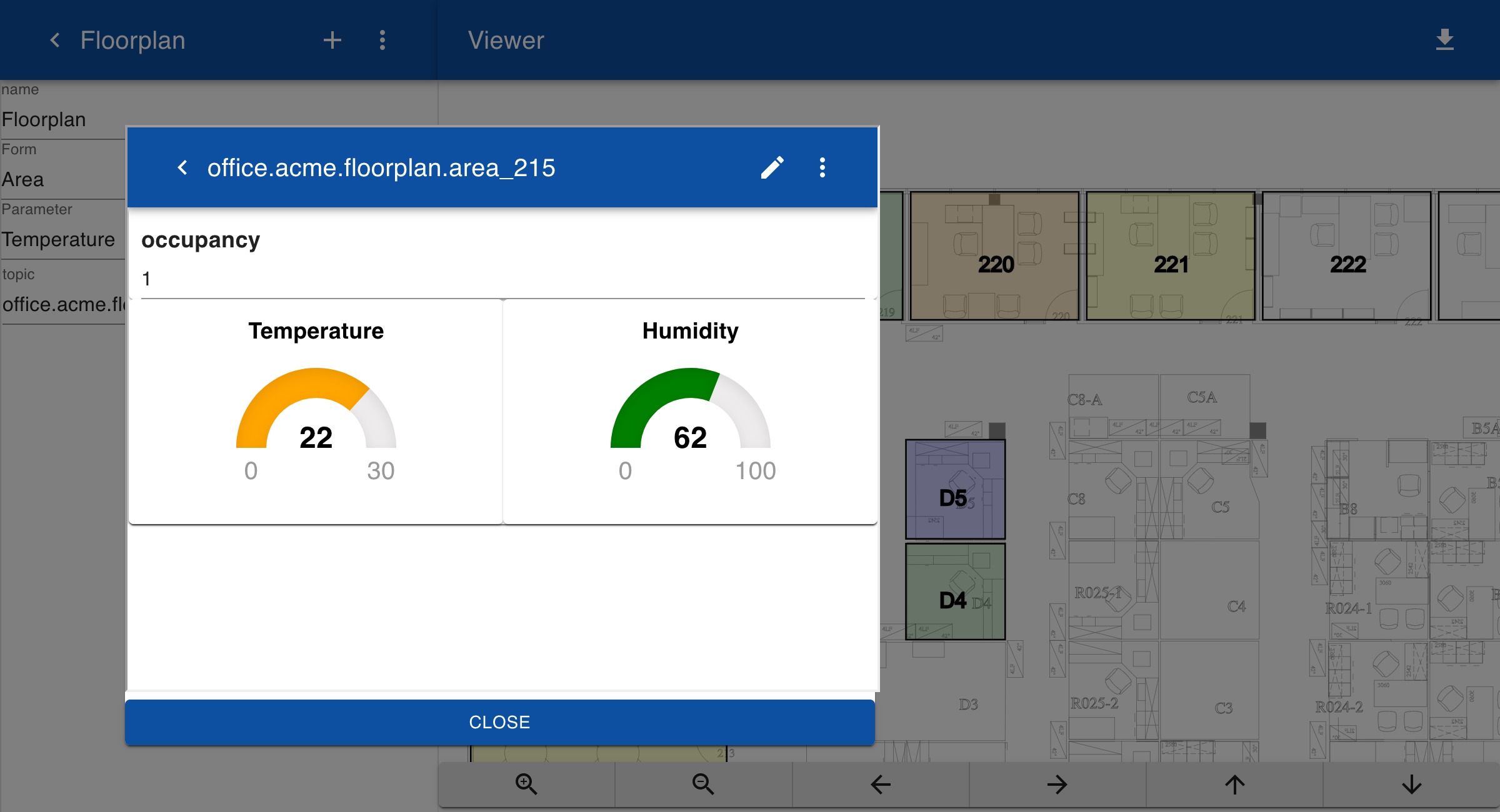 In this example we show how you can overlay an existing floor plan in SVG to show area properties such as temperature or humidity. In the 'Files' section import the file 'floorplan.svg' that shows the layout of an office.