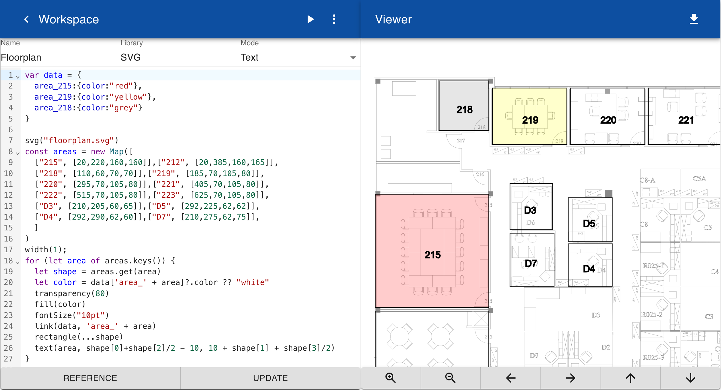 First we create a Drawing in text mode. The drawing includes a default variable data that contains the colors of all areas. The SVG for the floor plan is included in the drawing using the function svg(floorplan.svg). Next, a map of all areas is defined. The key in the map is the number of the area and the value is an array of 4 values that specify the x-position, y-position, width and height of the area. A for loop is used to draw all areas on top of the SVG of the floor plan. The fill color is defined by the color field defined in data variable. A link is defined so that a user can click on an area to open a form. The second parameter of the link is the name of the topic that should be opened in a form, for example area_212.