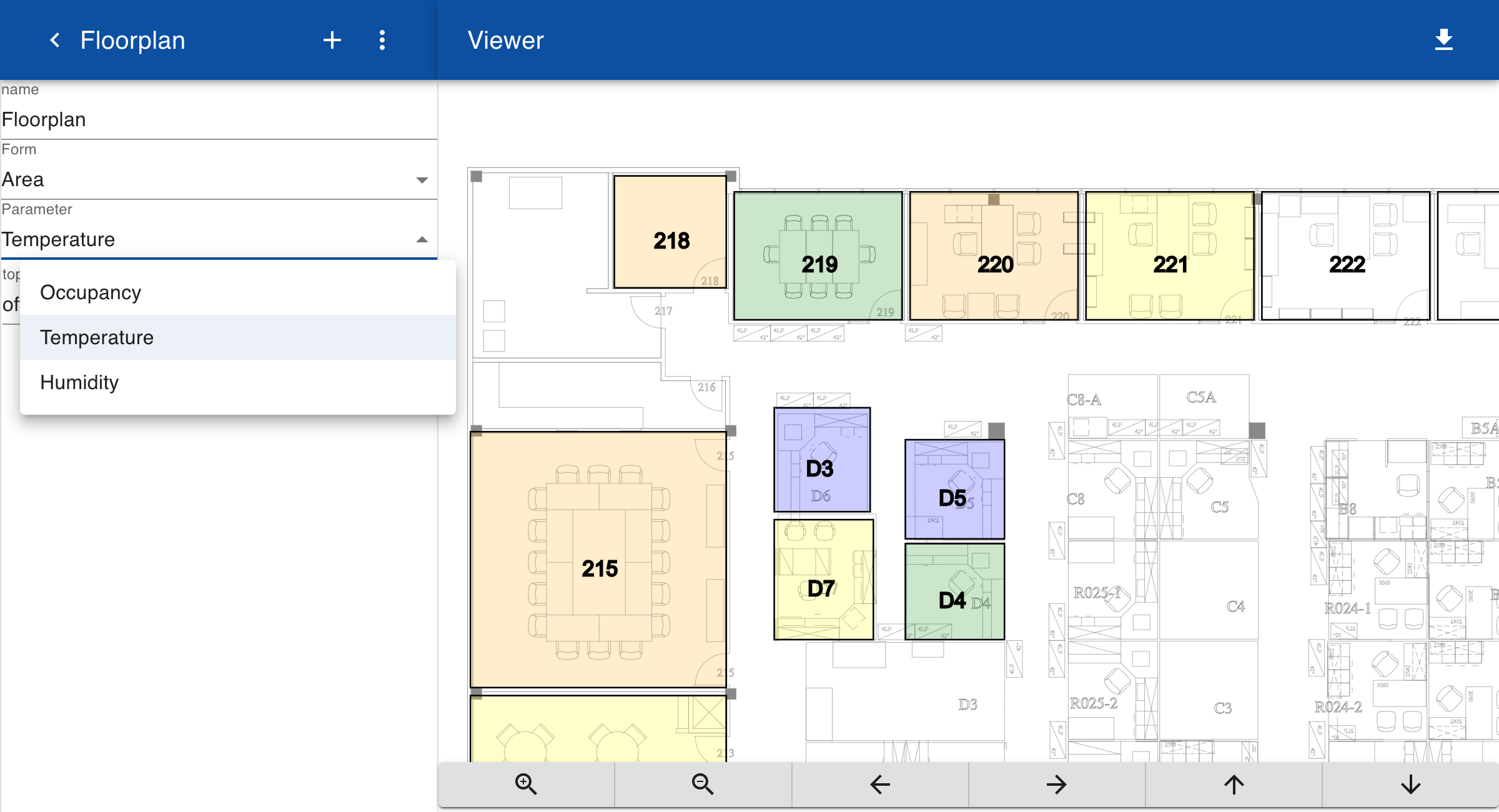 In this example we show how you can overlay an existing floor plan in SVG to show area properties such as temperature or humidity. In the 'Files' section import the file 'floorplan.svg' that shows the layout of an office.