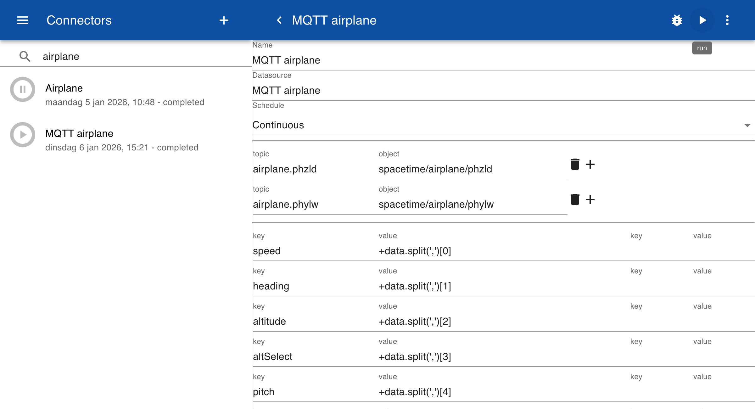 You can map the values in the comma separated list to keys, or sub topics, using the JavaScript split function. This converts the string into an array and each value can be retreived via an index in the array. The + sign converts the text to a number. After testing the connector set the schedule to Continuous. This way the connector is run automatically when new data is received from the MQTT server.