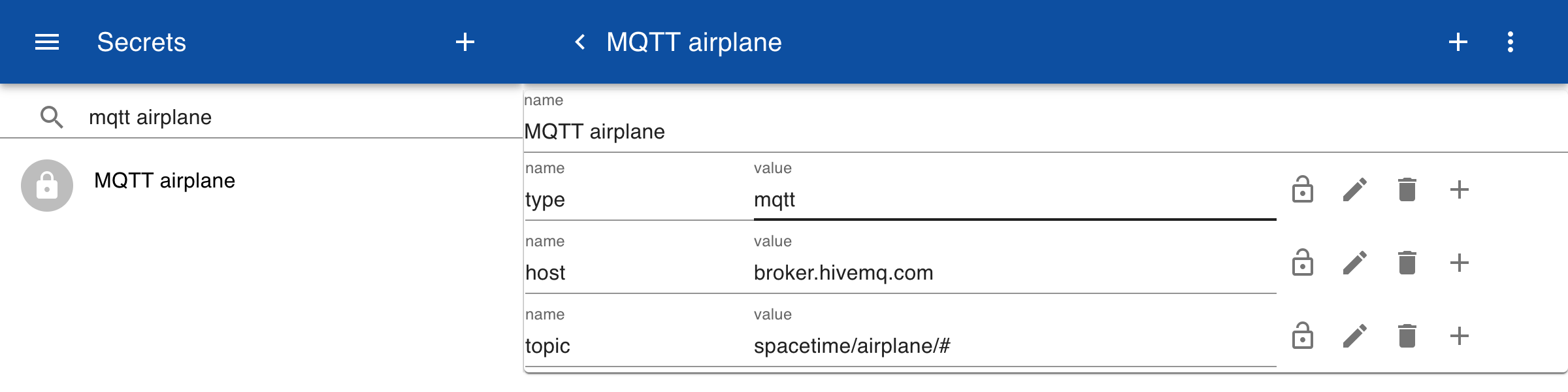 To receive the messages we first define a secret to store the information for the MQTT host. The type is set to MQTT and a free public domain host broker.hivemq.com is entered. This host does not need authentication. Then we specify the topic to which we want to subscribe. The # sign means that we want to subscribe to all subtopics.