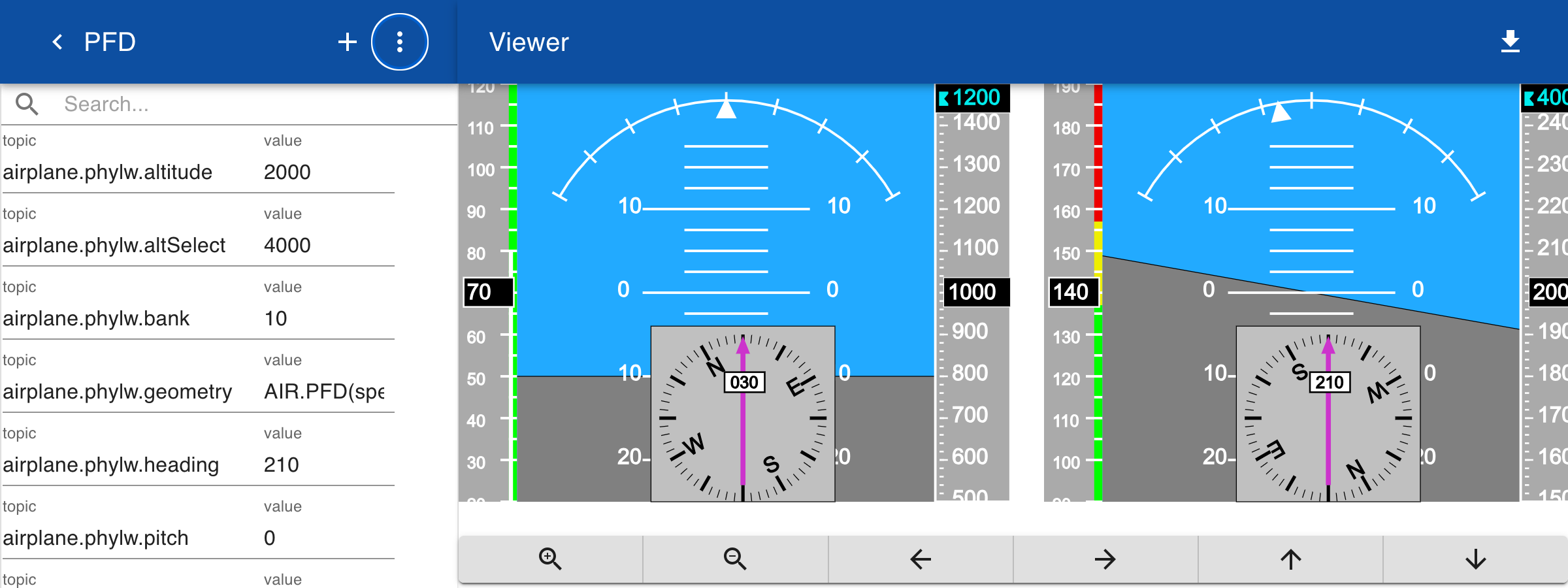 SVG diagrams can be used for real time monitoring and data visualization. In this example we show how to simulate aircraft monitoring by subscribing to messages from an MQTT server that represent the current state of two aircraft with the id pdzld and phylw. The current state is provided as a comma separated list of six numbers that describe the speed, heading, altitude, selected altitude, pitch and bank angle.
